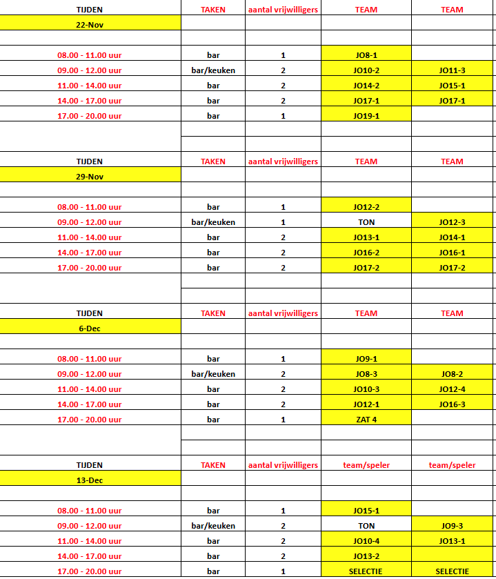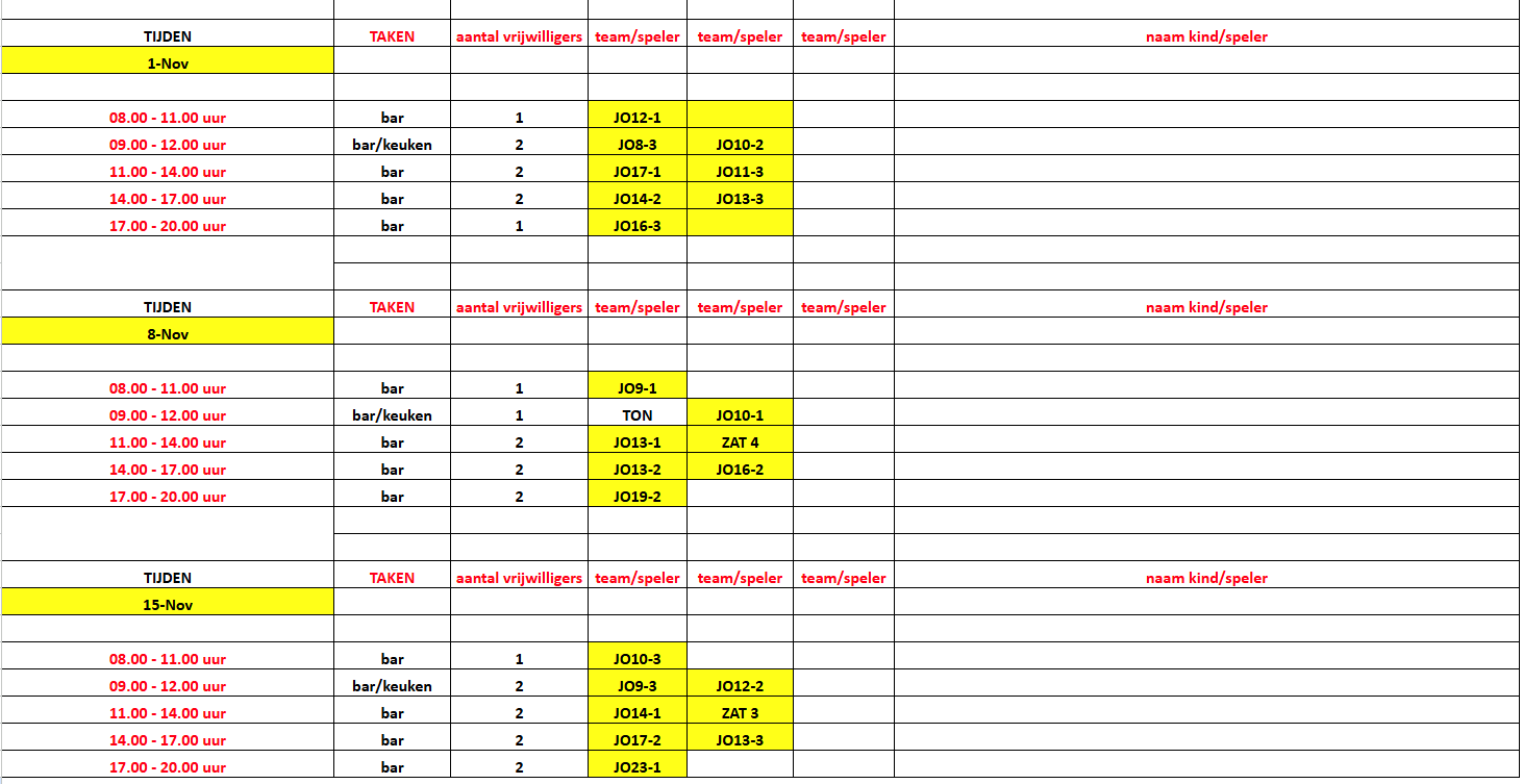 Graag de naam ouder/kind of speler die de bardienst/keuken gaat doen z.s.m. mailen naar info@vvgroeneweg.nl.